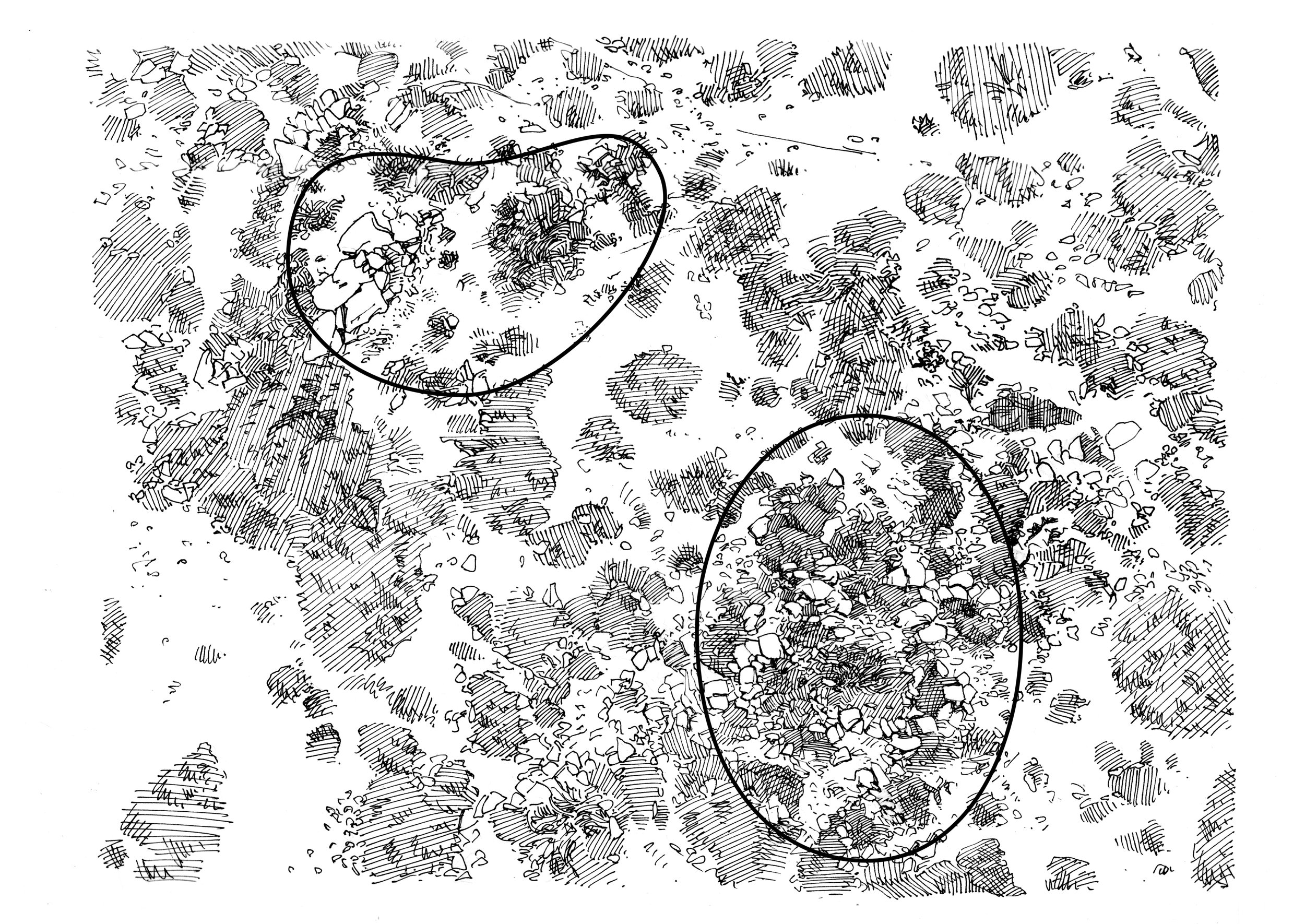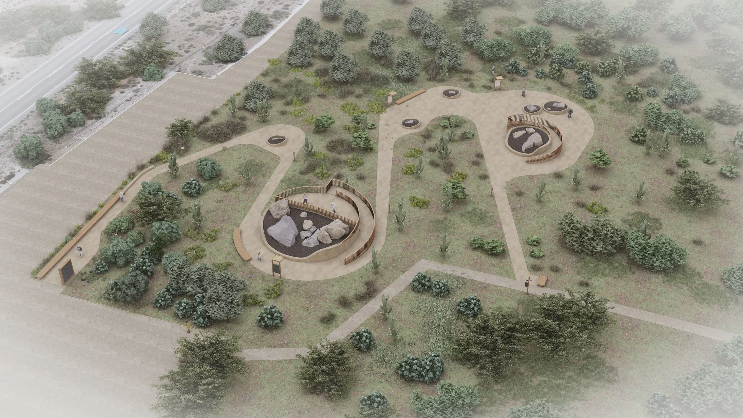 La disposición y orientación espacial de los bloques (aspecto relacional), invita a adentrarse en el recorrido de norte a sur a partir de una gran plaza central, generando dos grandes zonas de observación del arte rupestre, zona norte y zona sur, concentrados en grandes plataformas circulares que contienen y soportan los grupos de bloques principales interconectadas por senderos de hormigón pigmentado.